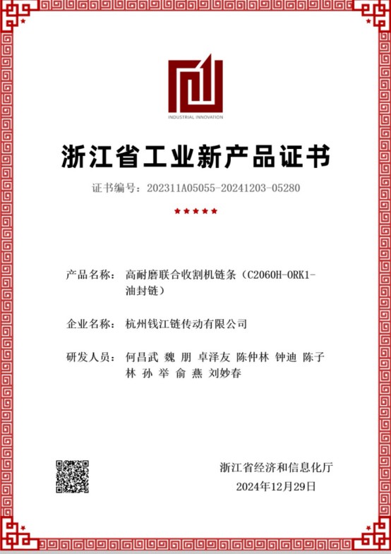 For at løse disse problemer udviklede virksomheden "Høj slidstyrke kombineret mejetærskerkæde C2060H-ORK1 Oil-Sealed Chain". Ved at optimere kædestrukturdesignet, bruge højkvalitets legeret konstruktionsstål, ved at anvende CNC-kompositmatricepræcisionsstemplingsteknologi og varmebehandling af isotermisk bratkølingsproces, forbedres styrken og overfladehårdheden af kædekomponenter, tætningsydelsen af smøreolie til indgribende dele forbedres, korrosionsbestandigheden øges, og levetiden forlænges.