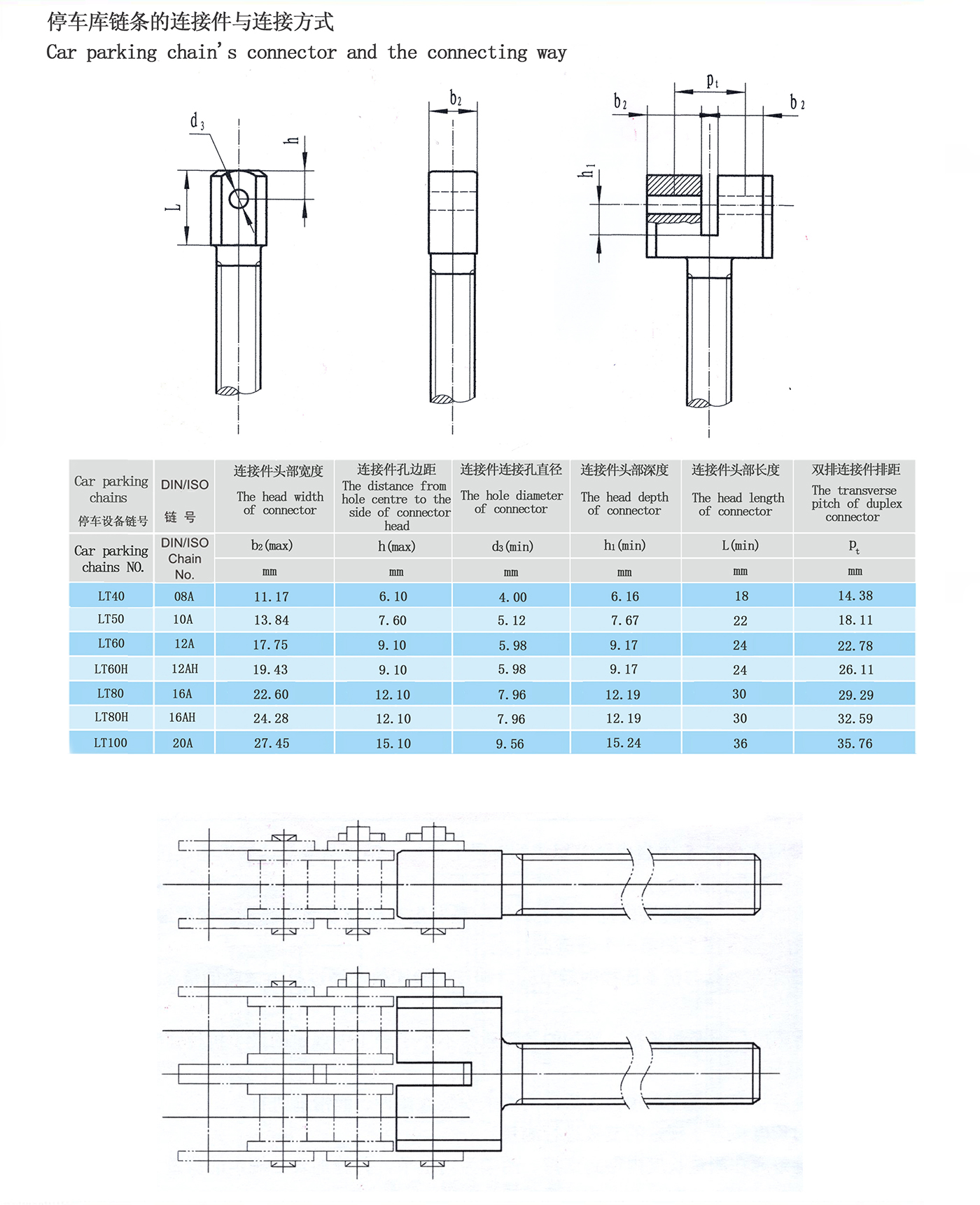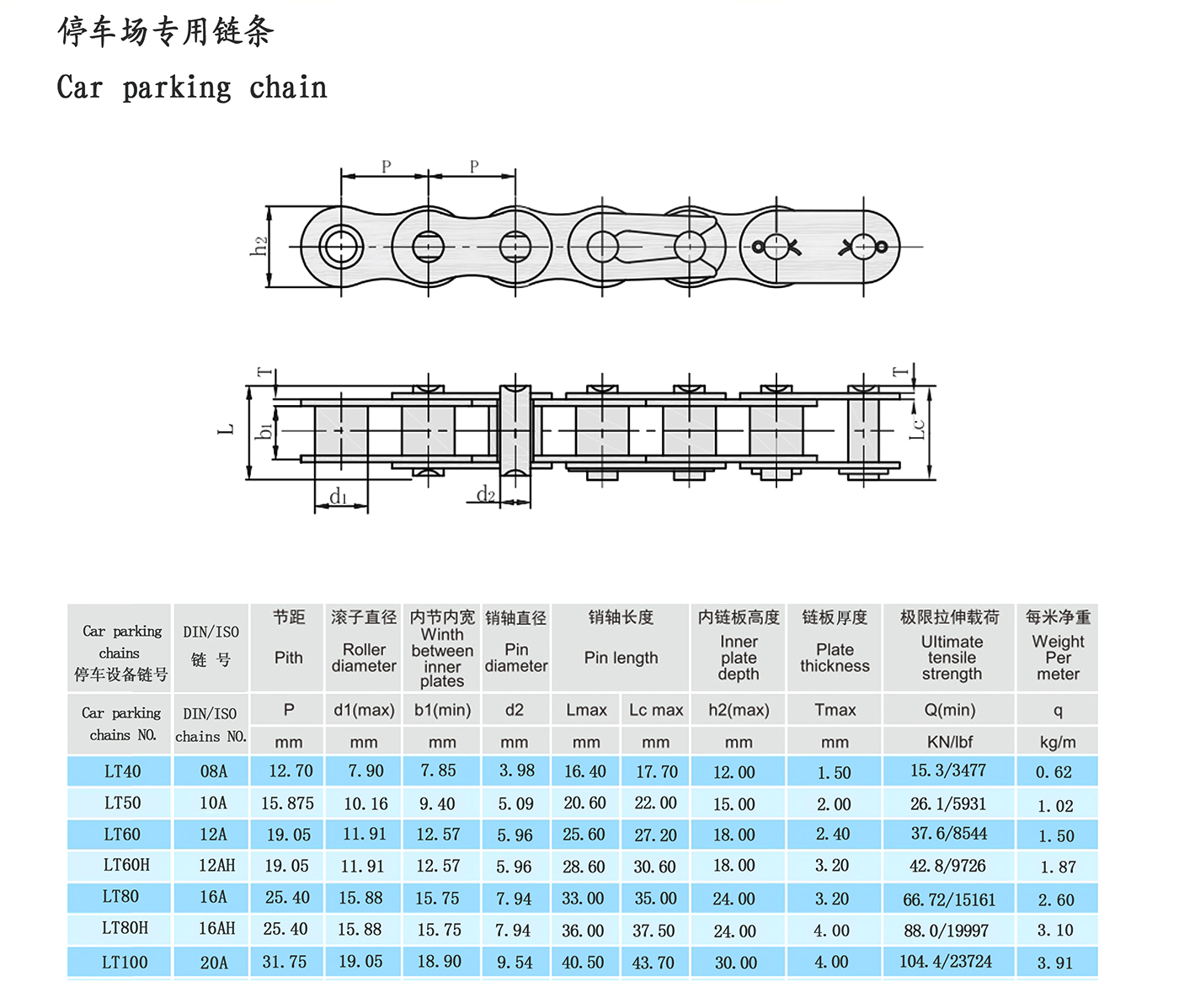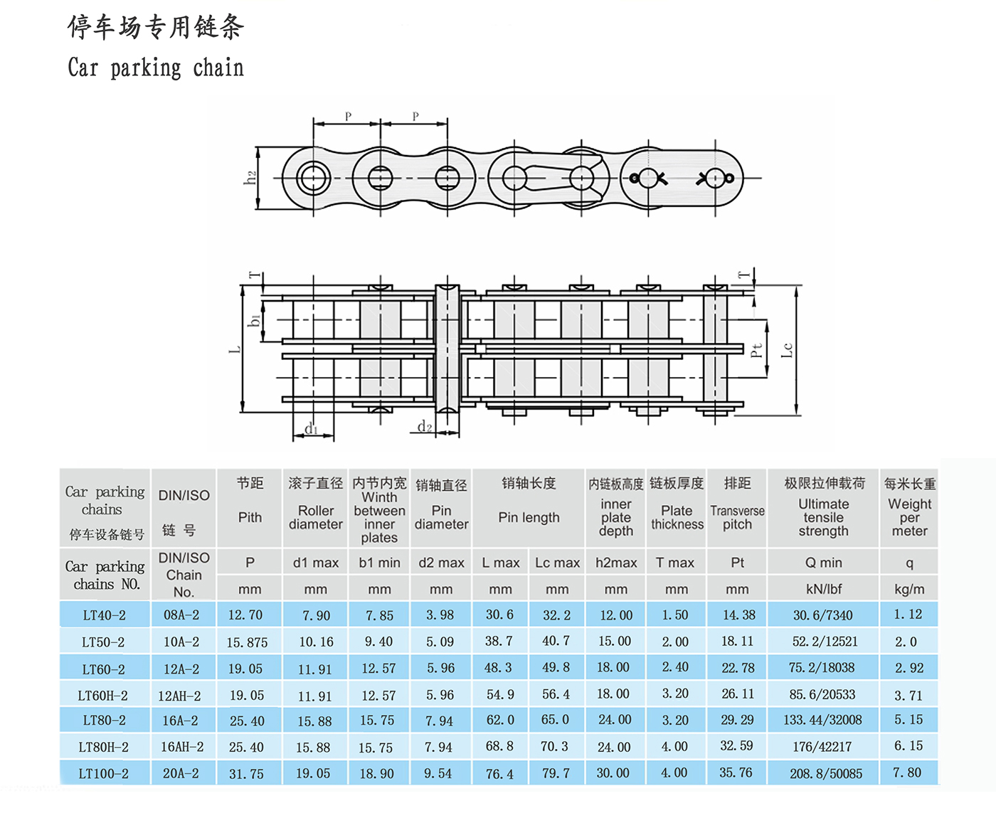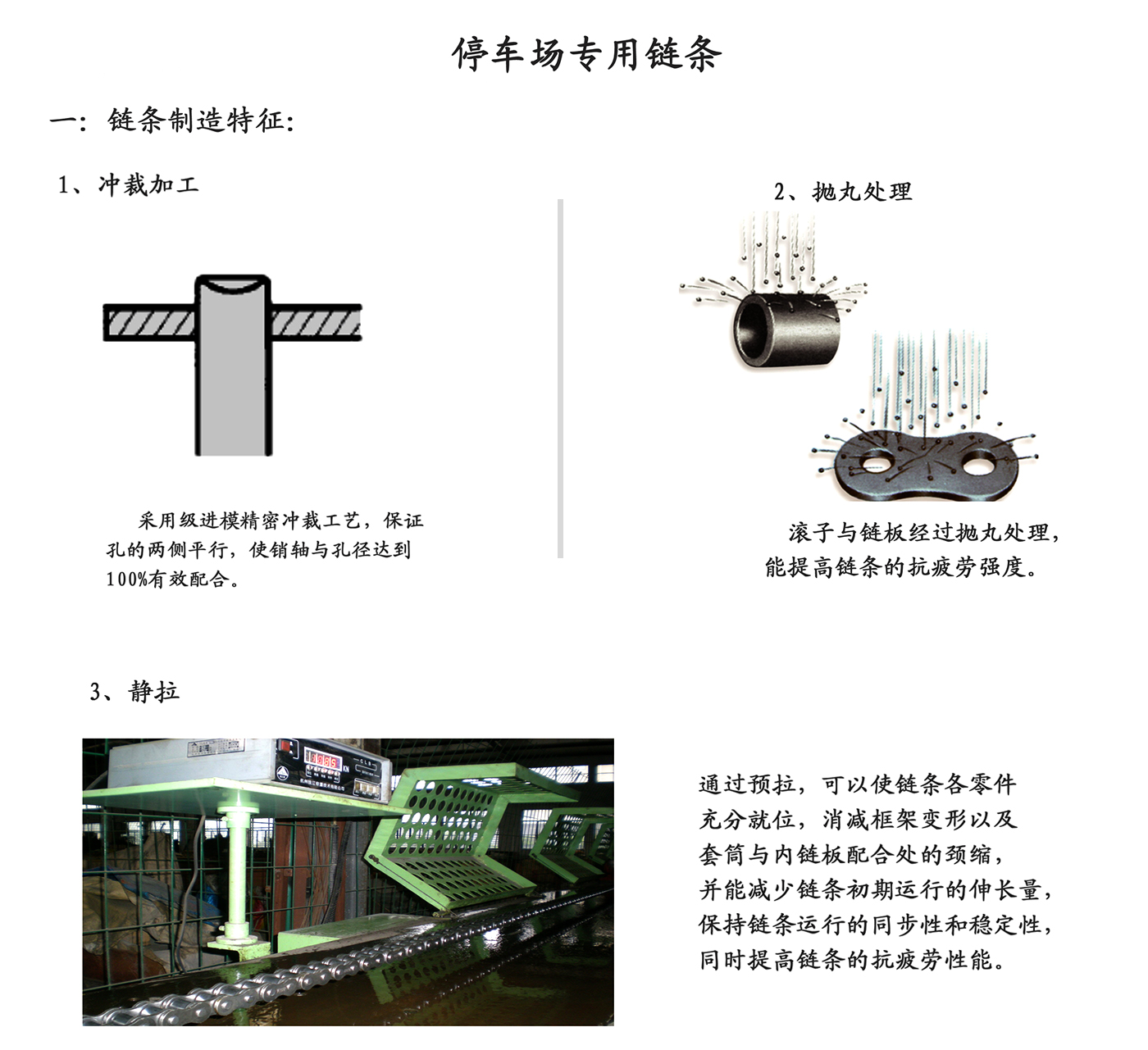 Kæden af det intelligente tredimensionelle parkeringsudstyr er anden-trins transmission af hoveddelen af parkeringsudstyret. Implementeringsstandarden er JB/T11079-2011. Kædens brugskarakteristika: stor bæreevne, høj trækstyrke (statisk styrke), minimumstrækstyrken er 10%-30% højere end almindelige præcisionsrullekæder', forvrængningsindekset, kædelængdens nøjagtighed, træthedsmodstand osv. er også højere end de almindelige præcisionsrullekæders.